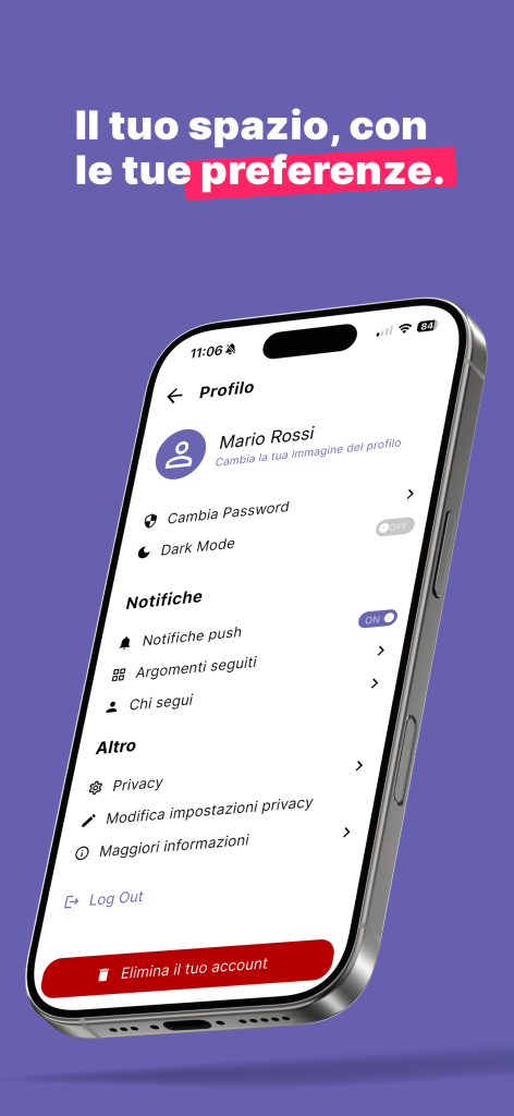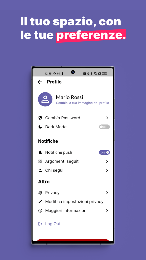 L’app introduce anche una sezione Profilo che consente all’utente di intervenire direttamente sulla propria esperienza: scegliere il tema (light o dark), gestire le notifiche push, controllare impostazioni e privacy.